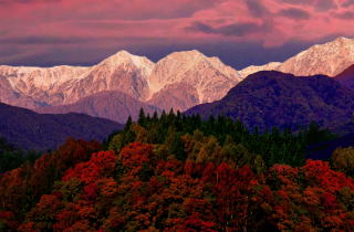 紅葉の最盛期に強い寒波襲来し白馬三山が白く絶好のシャッターチャンスに恵