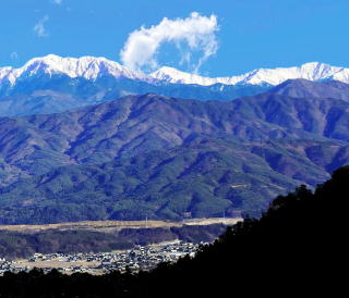に立てる。釜無川の谷の先に南アルプスの名峰。左から北岳・甲斐駒・仙丈岳。
