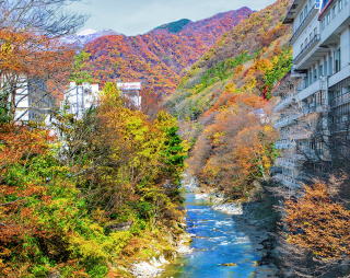 だ。山頂付近の豪雪に磨かれた布団菱と呼ばれる岩峰が見事な紅葉の先に聳え