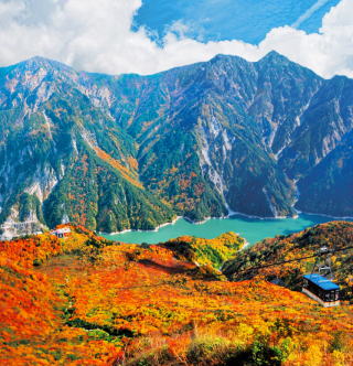 立山ロープウェイ大観峰より紅葉の黒部湖を俯瞰。立山側は順光なので鮮やかな紅葉だが対岸の