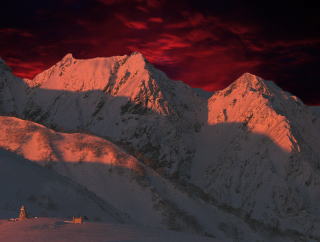 との対比を強調するため白馬岳の東斜面の赤みをとる補正。さらに彩度とコントラストを強め