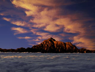 日没近く涸沢槍が一瞬姿を見せたのねで山小屋の灯とコラボで狙う。涸沢槍はすぐ雲間に姿を消
