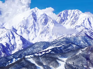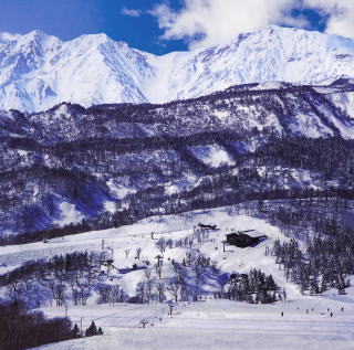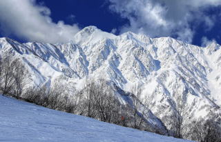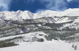 とゲレンデの先に白馬三山が八方尾根とは違う感じで並ぶ。八方尾根に比べ白馬岳が大きい。右