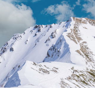 尾根にかけて見事に残り雪面の美しさは白馬連峰随一と言われている。中央の三