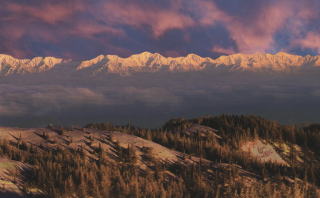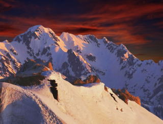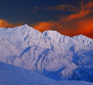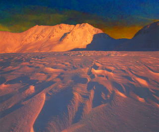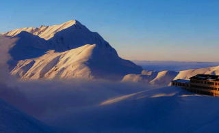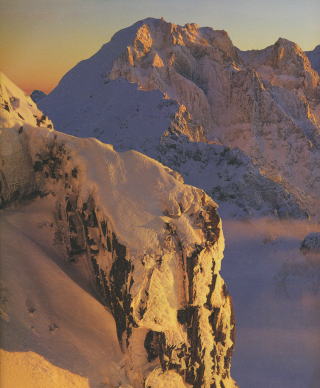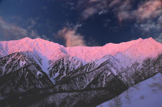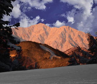 完全に雪に埋まった八方尾根二の池付近よっりモルゲンロートに輝