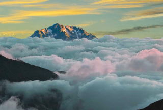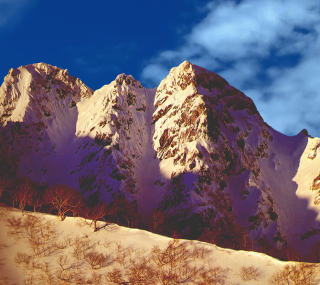 八方尾根第二ケルンより淡いピンクに輝く帰らずの嶮第二峰を切り取る。雪に埋まり