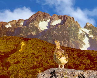 岩上に姿を見せた雷鳥を剣岳をバックに切り取る。元データが温暖化が進む前の古いデータ