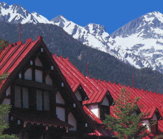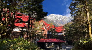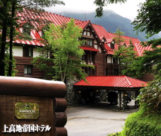 上高地帝国ホテルの赤い屋根が印象的な瀟洒な本館と丸ログのこれまた瀟洒な看板の