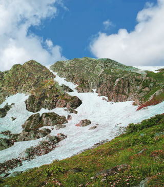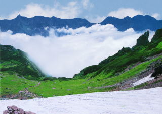 剱岳三の窓雪渓と並んで我国有数の美しさを誇る黒部五郎岳カール雪渓。夏なお豊富な残雪を