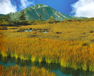 が秋の草紅葉もこれまた見事。湿原の先にそびえる薬師岳が堂々として立派だ。