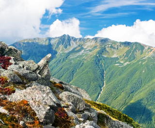 平野ではまだ残暑の残る9月下旬紅葉がはじまる。ハイ松の緑とナナカマドの赤の