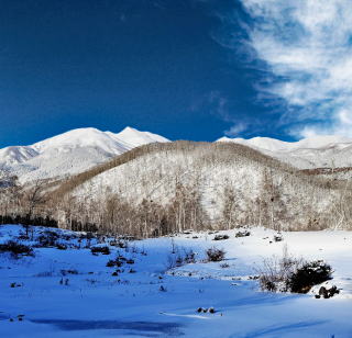 見えるビューポイント。厳冬期完全に凍結した牛留池の先に真っ白な剣ヶ峰が