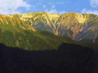 逆光、午後も槍穂高と針葉樹の疎林の斜面の角度が違うので槍穂高は明るく輝くが