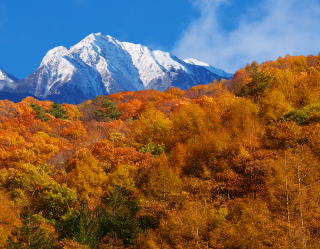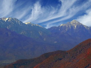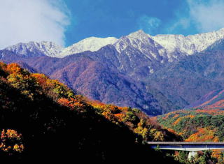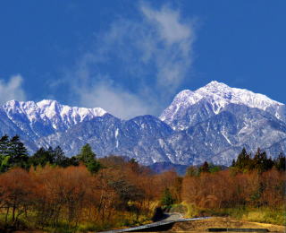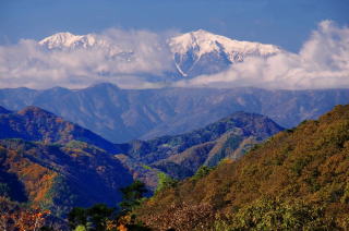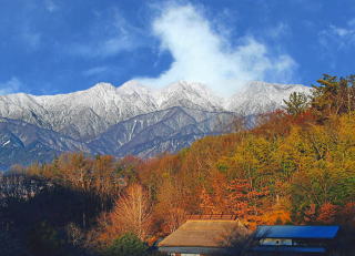 紅葉の最盛期に新雪に恵まれたラッキーな一枚。温暖化進行で南アルプスに新雪がくるのが