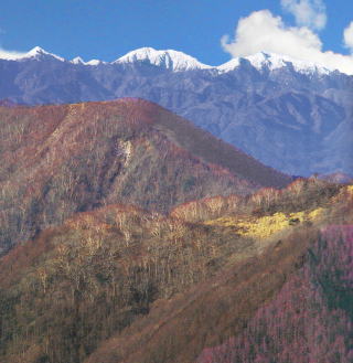 温暖化進行で新雪が遅くなり紅葉は殆ど終わっている。右甲斐駒左アサヨ峰。