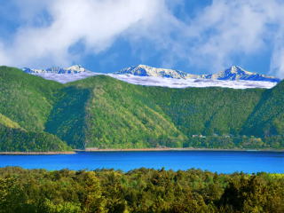 湖の先で青木ヶ原樹海を抜けると白根三山が辛うじて姿を見せる。ブルーレイク本栖湖の上に雲