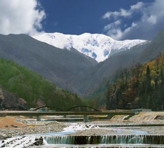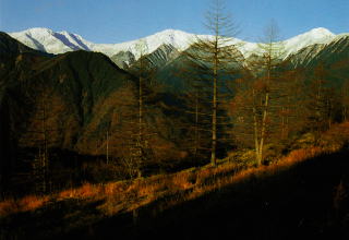 仙丈ケ岳と塩見岳が谷間の切れ目より眺望できる。カラマツの紅葉が見事な林道なので