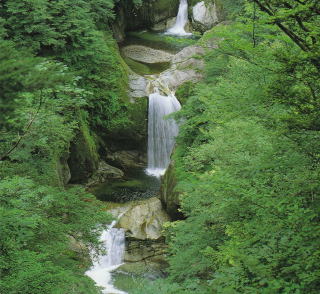 尾広川右岸の渓谷道を遡行する。百合ヶ淵を過ぎると三段三ツ釜の神蛇滝を真っ正面に眺