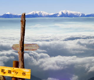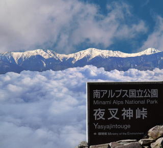 雲海に浮かぶ白根三山の典型的な画像なのでアクセントとして夜叉人峠表示板をAI