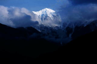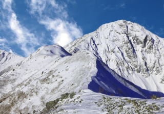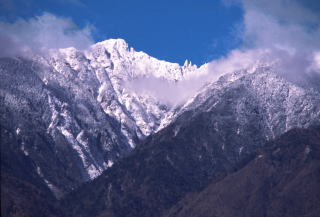 甲斐駒より野呂川源流の谷越しに仰ぐ北岳はヒマラヤの巨峰を連想させる風格がある。右に延びる稜線は
