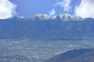に立てる。釜無川の谷の先に南アルプスの名峰。左から北岳・甲斐駒・仙丈岳。