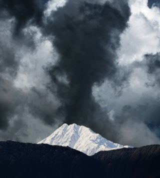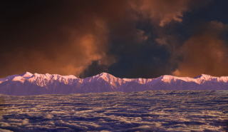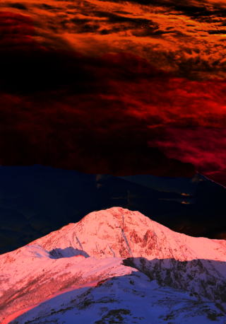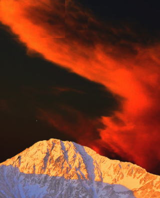 モルゲンロートに輝く北岳上空に出現したオーロラを連想させるような巨大なアカネ雲。縦長画像