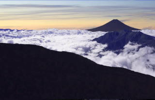 からは鳳凰三山の上に浮かぶ富士を見る。眼下の甲府盆地は雲海がよく見られるので狙い