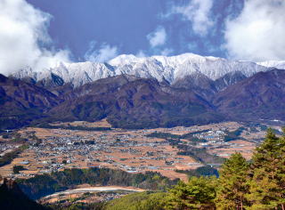 台として知られている。左下が天竜川。中央右の白い山が空木岳そ