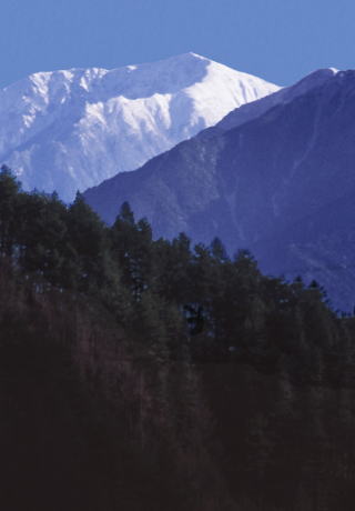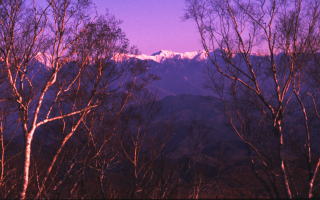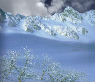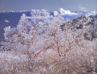 く知られている。ダケカンバの霧氷を大きく切り取り南アルプスを