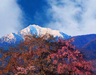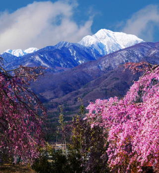 長野県と山梨県の県境信濃境より満開の桜と白く輝く甲斐駒を狙う。信濃境の池袋(地名)付近に桜と