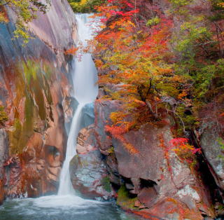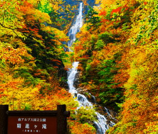 南アルプス随一と言われ日本の滝100選でもベスト10に入る名瀑。精進ヶ滝(上)と