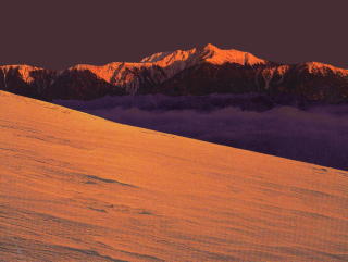 びっしりと雪が付いた仙丈岳カールが鮮やかなピンクに染まった。ただ吹雪のビバークだけはは本