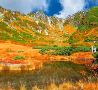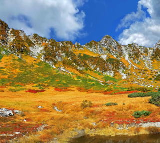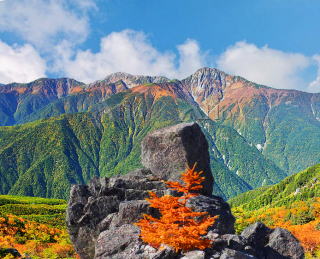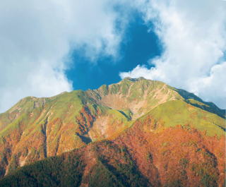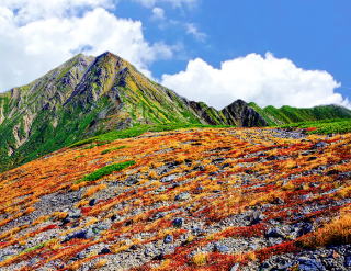 宝剣岳から極楽平方面の南東斜面は草紅葉が見事だ。鮮やかな草紅葉の中に点在するハイマツの緑と