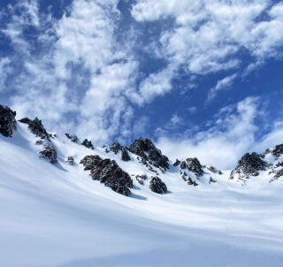 ベッタリ雪が付き美しい雪面を見せる。東斜面なので朝日に輝きシルエットの富士と絶妙の