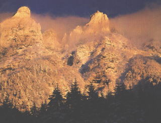 の岩峰が迫力ある姿をみせる。夕日に鮮やかに輝いている。