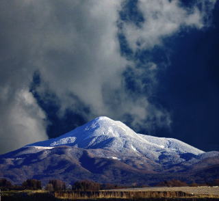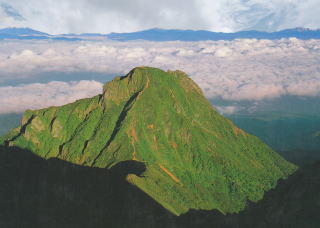 コニーデ型火山の典型的な円錐形の山頂を見せている。巨大なえびのしっぽから風の強