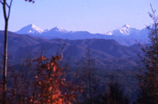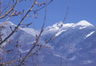 小野峠付近の展望台からは南アルプス北部の山々もよく見える。左に端正な三角錐をみ