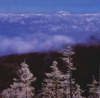 林が広がる。諏訪湖方面からの上昇気流が霧となり霧氷を作る。