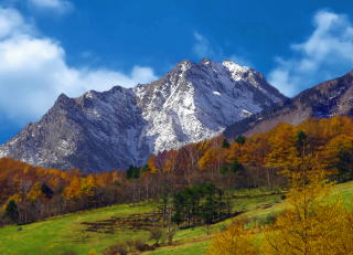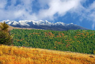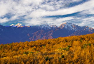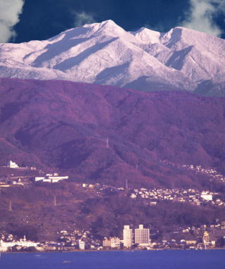八ヶ岳連峰の中でも天狗岳はとりわけ雪の付きがよい山。青い諏訪湖・赤茶に染まる紅葉の