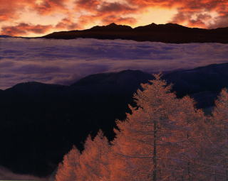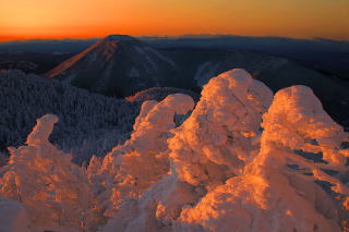 るので見事な樹氷ができる。暗く沈んだ蓼科山と夕日に輝く樹氷は絶好のターゲット。