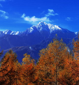清里高原にはカラ松林が多い。紅葉の最盛期の甲斐駒が新雪に輝くと最高の狙いとなる。た