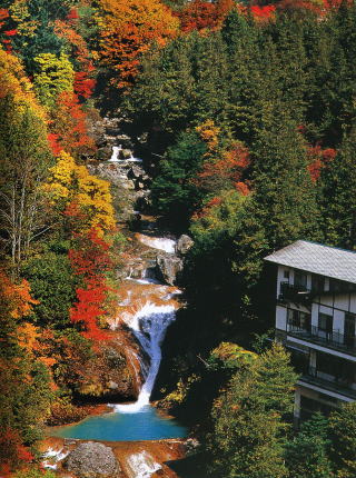 泉街を流れる谷の紅葉が見事。松本からR254を走り三才山トンネルを抜けるとすぐ。